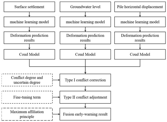 - In order to solve the problems of low credibility of a single source of information and the failure of fusion of highly conflicting evidence from multiple sources, an improved multi-source information fusion early-warning method is proposed. The three sources of information, namely surface settlement, groundwater level, and pile horizontal displacement, are considered together, and the predicted values of multiple monitoring items are fused for early warning based on the newly defined evidence correction parameters and optimized fusion rules. The results show that the method proposed in this paper outperforms the single information source method and the traditional D-S method. The proposed method has high accuracy and effectiveness.