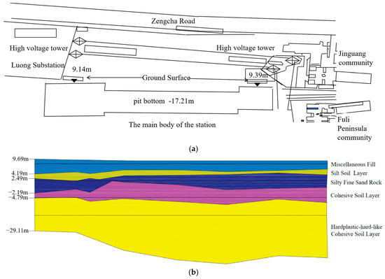 The station is an underground three-level side station with a total length of 220 m, a total construction area of 24,570 square meters, and a standard section width of 34 m. Open excavation is performed in the project at an excavation depth of approximately 24 m. The primary enclosure system employs a 1 m thick underground diaphragm wall with internal support. The station features environmentally complex surroundings, adverse geology including proximal fracture zones, and significant groundwater presence. Site configuration and structural cross-sections are depicted in Figure 2a,b, respectively. And its geotechnical parameters are shown in Table 1.