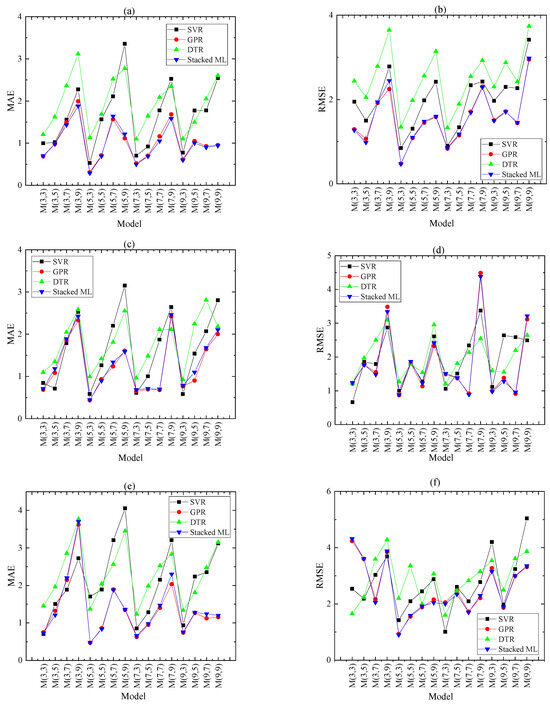- For the same risk source, the MAE and RMSE are similar. This indicates that the training data have no obvious outliers and can be better adapted to model training. From Figure 6a,b, the MAE of surface settlement ranges from 0 to 3.5 and the RMSE ranges from 0 to 4. From Figure 6c,d, the MAE of groundwater level ranges from 0 to 3.5 and the RMSE ranges from 0 to 4.5. From Figure 6e,f, the MAE of pile horizontal displacement ranges from 0 to 4.5 and the RMSE ranges from 0 to 5.5.