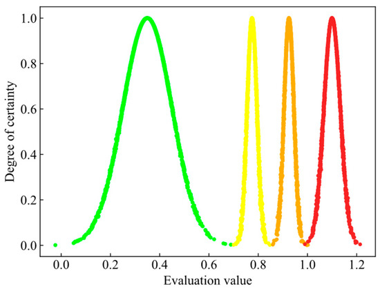 Standard cloud for accuracy of target recognition. Green represents the cloud model corresponding to safe. Yellow represents the cloud model corresponding to the yellow early-warning. Orange represents the cloud model corresponding to the orange early-warning. Red represents the cloud model corresponding to the red early-warning.