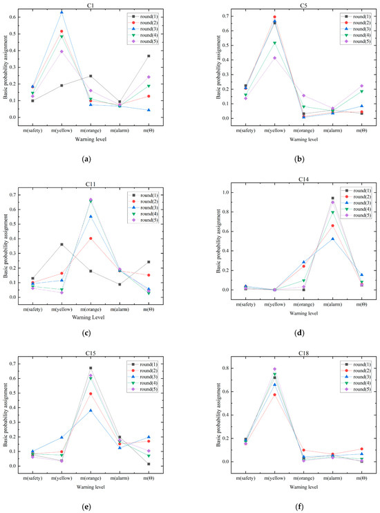 Fusion early-warning process. (a) C1. (b) C5. (c) C11. (d) C14. (e) C15. (f) C18.