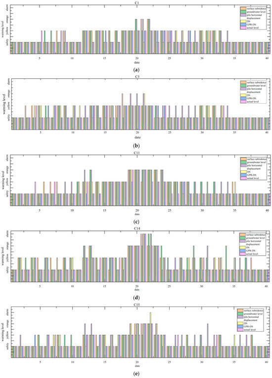 (1) Analysis of actual early-warning results. Figure 9a–f represent the changes in early-warning results over time for different monitoring points. The pink bar indicates the actual early-warning level. The highest actual early-warning level of C1, C5, and C18 is yellow, the highest actual early-warning level of C11 and C15 is orange, and the highest actual early-warning level of C14 is alarm. This shows that the collapse risk of monitoring point C14 is the highest, followed by C11 and C15, and the collapse risk of C1, C5, and C18 is lower. For C14, it can be seen that from day 1 to day 11, the monitoring point is basically in a safe state, indicating that the risk at this point is in a controllable range and no early warning has occurred. From day 12 to day 18, the yellow early-warning status occurs, which indicates that the pit is beginning to have the possibility of unsafe deformation, and the operator should start to pay attention to the deformation situation and communicate it in a timely manner in the daily meeting. The actual early-warning level on day 19 to day 20 is orange, the alarm is triggered on day 21 and eliminated on day 22 to day 23 but is still in the orange early-warning state, indicating that there is a large potential risk of collapse and that immediate measures should be taken until the risk is reduced to a safe state before construction can continue. It is essentially in a safe condition from day 24 to day 40, indicating that the measures taken had a positive effect and that no deformation collapses occurred.
