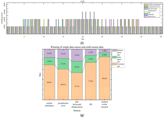 The results of single data early warning and multi-data fusion early warning. (a) Early-warning results of monitoring point C1. (b) Early-warning results of monitoring point C5. (c) Early-warning results of monitoring point C11. (d) Early-warning results of monitoring point C14. (e) Early-warning results of monitoring point C15. (f) Early-warning results of monitoring point C18. (g) Early-warning results for single and multiple data sources.