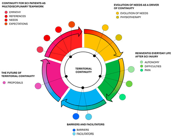 Territorial continuity of care, for patients with SCI and health professionals, represents an ongoing challenge of multi-professional integration, in which the patient rediscovers themself to maximize residual resources, and deals with a “new” normality. This study highlighted that the concept is not static, but evolves with time and the patient’s needs: if at first the emphasis is on physiotherapy, desiring the highest possible functional recovery, the progressive emergence of complications (e.g., neurogenic bladder dysfunction) makes the intervention of other figures, such as the nurse, central. In addition, in the long term, the need to reconnect with the social world by making new experiences, with the involvement of psychologists, occupational therapists, sports therapists and social workers, emerges.