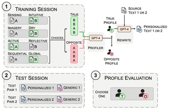 The present study comprises three components, summarized in Figure 1. The first component, referred to as the training session, aims to identify the students’ learning preferences. During the training session, the student selects their preferred paragraph from a pair of science texts a total of four times. Each pair discusses the same topic and contains the same content. To capture a range of text presentations, the paragraphs within each pair were rewritten using GPT-4 to target the extremes on one dimension of the Felder–Silverman model []. This model consists of four dimensions assessing how students best perceive (sensing or intuitive), receive (visually or verbally), process (actively or reflectively), and understand (sequentially or globally) information. Because this work focuses on text as an educational medium, the visual/verbal dimension was implemented as an imagery/no-imagery dimension.
