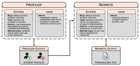 Data from the training session is fed into two GPT-4 agents (v. gpt-4-1106-preview, temperature: 1.0). The first agent uses the student’s choices to generate a short description (or “profile”) of the student’s preferences. Once generated, this profile is fed into the user message of the Rewrite agent. The Rewrite agent then outputs a profile-aligned version of a given science-related text. We have made these training paragraphs along with the two agents’ prompts available on the first author’s GitHub page []. The main components of the prompts for these agents are highlighted in Figure 2.