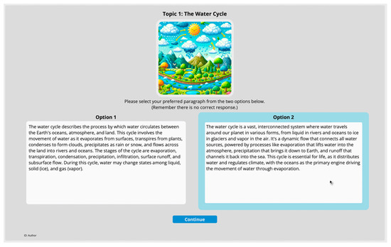 A screenshot of the GUI during the training session is presented in Figure 3. The same layout was also used in the test session. The GUI was designed to be simple and intuitive. In addition to stating the topic of the paragraph pair and providing the text options, a related, pre-generated image was included to add some visual intrigue. The images used across the six science topics were the same for each participant. Participants were provided with the simple instruction to “Please select your preferred paragraph from the two options below” and the gentle note to “Remember there is no correct response”.