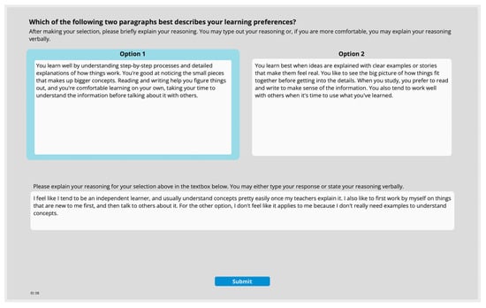 Of the 9 students who selected their opposite profile during the profile evaluation phase, 7 explicitly referenced themes that were discussed in the options presented. As an example, one student justified their selection of the opposite profile by saying the following: “I enjoy straightforward, factual information because it makes more sense. I like factual information because it’s more clearly described so that I can more easily understand it.” Table 5 presents this student’s true and opposite profiles for reference. While the preferences noted in the true profiles did not resonate with these 7 students, we note that there were 9 students who selected their true profile. This suggests that more data (e.g., qualitative descriptions of preferences from structured interviews or surveys, additional preference measures like past achievement) may be needed in the training session to accurately capture these dimensions of students’ learning preferences.