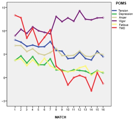 Table 1 and Figure 1 show the descriptive values (mean and standard deviation) of the POMS variables (tension, depression, anger, vigor, and fatigue), as well as the TMD (Total Mood Disturbance) index across 16 matches played by the 21 players analyzed.