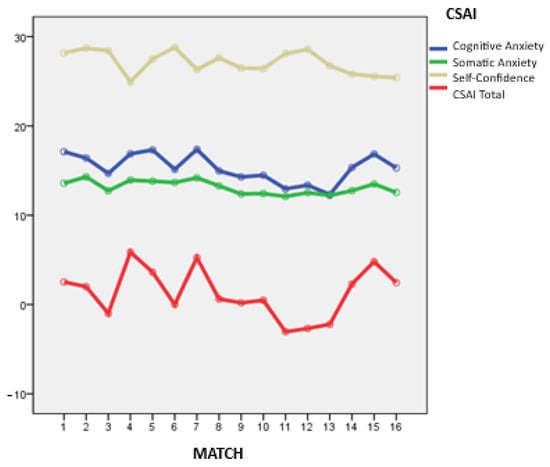 Concerning the self-confidence variable, a relatively stable pattern is identified, although with some fluctuations, highlighting a slight decrease in scores from the first to the sixteenth matches. Meanwhile, the total CSAI index (total CSAI) shows the greatest variability in scores. Despite this notable instability, the scores obtained in the first and last matches are very similar.