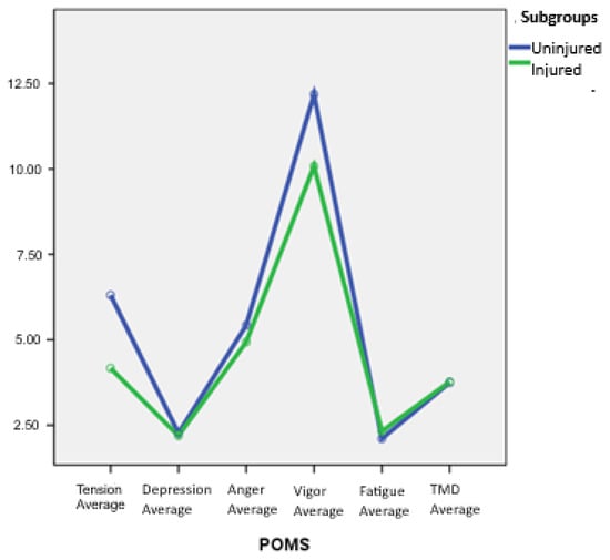 Additionally, Figure 3 illustrates that both subgroups exhibit an iceberg profile, which is more pronounced in the “no injury” group for the factors vigor and tension.