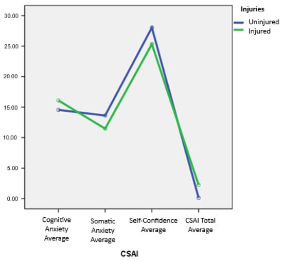 Additionally, Figure 6 shows greater dispersion in the total CSAI score in the group with injured players compared to the non-injured group.