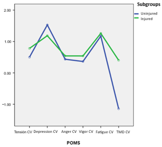 Figure 5 shows that the injured group has greater mood variability in all POMS factors except depression. Notably, the TMD index shows greater stability in players without injuries.