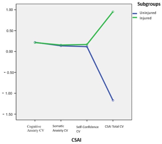 Differences in coefficient of variation scores of the CSAI-2 over the average of 16 matches between non-injured (n = 15) and injured (n = 6) players.