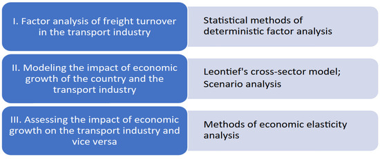 The national statistical services in Ukraine and Poland account for this indicator of land and pipeline transport, water, and aviation. Land transport consists of rail and road transportation. This indicator is the basis of the methodology for analyzing economic development’s dependence on the transport industry’s functioning, the stages of which and their methodological support are shown in Figure 2.