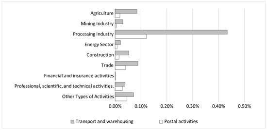 Using Equations (8) and (9), scenarios of a 1% increase in final demand for each industry’s products were calculated, with a simultaneous assessment of the relevant shifts in expanding transport service volumes for Poland, as illustrated in Figure 4. The difference was that the transport industry breakdown considered ground and pipeline transport, water and air transport, and warehousing.