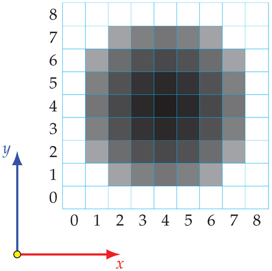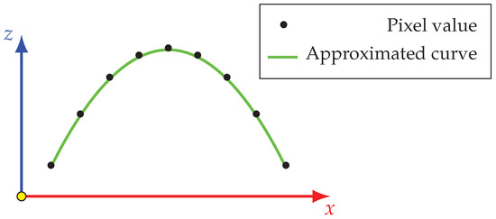 As shown in Figure 3, each pixel’s measured value represents the distance between the camera and the object’s surface. These values are visually represented in shades of gray, with black and white denoting the minimum and maximum distances, respectively. Since data are captured only at integer pixel positions, intermediate values between neighboring pixels are absent. To address this, a curve approximation algorithm is applied to transform scattered data into an analytical equation, allowing interpolation at any coordinate (x, y).