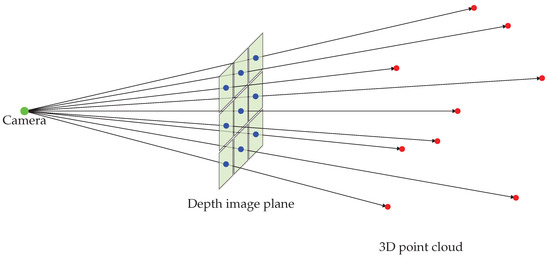 After approximating each row of the depth image as a curve, it becomes possible to evaluate the surface value at any given point. To assess the surface at coordinates (x, y), the first step is to determine the two neighboring rows of the depth image using Equation (10). The deprojection of the 3D point cloud into the depth image is shown in Figure 5.