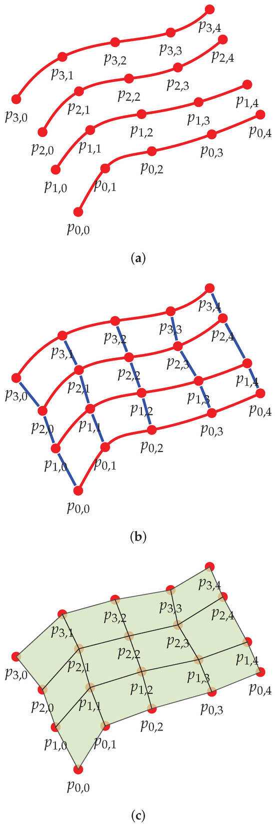Weaving points to generate a surface. (a) Evaluating points on approximated curves. (b) Linear interpolation of neighbor curves. (c) Forming surface from adjacent interpolated points.