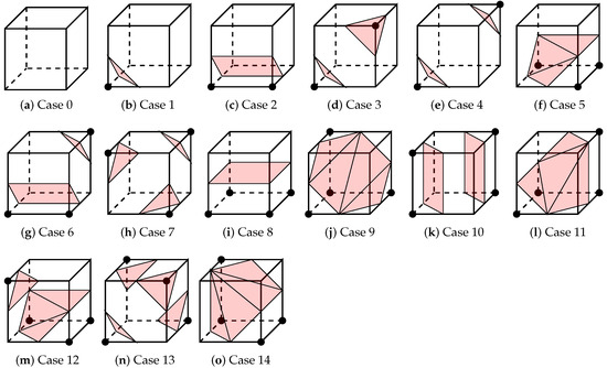 As a marching cube consists of eight vertices, each with two possible states, there are a total of different cases. However, only 15 cases are unique, while the remaining cases are simply a combination of inverted, rotated, or flipped variations of the unique instances. The 15 unique variations of a 3D marching cube are depicted in Figure 10 [14].