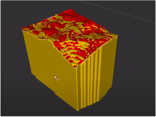 The marching cubes algorithm employs a three-dimensional discrete scalar field to extract a 3D mesh from an iso-surface. In this particular case, the iso-surface is constructed from the surface reconstruction detailed in Section 3.4. Each vertex includes a Boolean value that indicates whether it lies inside the soil or not. The z coordinate of the reconstructed surface is calculated at the same (x, y) coordinates of the vertex. If the z value of the vertex is lower than that of the reconstructed surface, it signifies that the vertex lies below the soil surface.