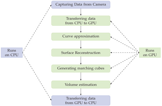 Figure 12 represents the overall flowchart of the developed algorithm, and the hardware assigned for each task. It is shown that the majority of the computation is done on GPU alone and CPU is only used for transmitting data back and forth from system and GPU memory while needed. In this study, A laptop from Lambda, based in San Francisco, US, featuring an Intel Core i7-8750H processor, 32 GB of DDR4 RAM, and an Nvidia GeForce RTX 2070 Max-Q GPU was used to perform the implemented algorithm.