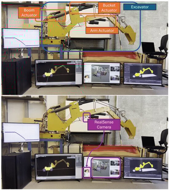 The experiments were performed on an electric excavator, as shown in Figure 13. The depth camera was mounted on the excavator’s boom link to provide an unobstructed view of the excavation area. The camera used in this experiment was the Intel® RealSense™ Depth Camera D455 from US.