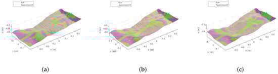 To validate the accuracy of the curve approximation, the raw data points and the approximated curves were plotted to visualize the results of the developed surface reconstruction algorithm. This validation performed before the first digging cycle, after the first digging cycle, and after the second digging cycle. The results for all three datasets are presented in Figure 14.