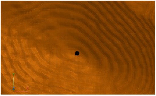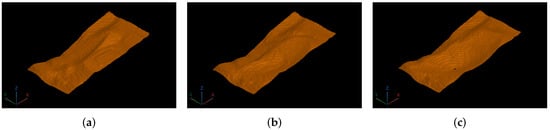 Subsequently, the points must be connected to form a cohesive surface. Each pixel in the depth image corresponds to a point in the 3D point cloud, and the connectivity data between neighboring points is preserved from the depth image. Consequently, it is possible to identify neighboring points in the depth image and establish a quad in 3D space. It is worth noting that the pixels (i, j), (, j), (, ), and (i, ) constitute a rectangle in the depth image. Consequently, their representation in the 3D point cloud also forms a quad in the same sequential order. By combining these quads, a continuous and hole-free surface of the area captured by the depth camera is constructed, effectively representing the shape of the soil in the excavation area as shown in Figure 6.