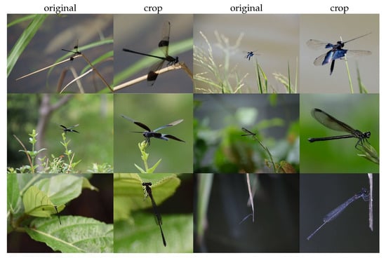 The dataset processed by YOLOv10 object detection excluded images without dragonflies, blurred images, and those with minimal dragonfly presence. For images containing small dragonflies, the detected regions were cropped to isolate the dragonflies, as illustrated in Figure 2, thereby removing most irrelevant background. In images with multiple dragonflies, each detected bounding box was cropped and saved as an individual image. Notably, when cropping the predicted bounding boxes generated by YOLOv10, the authors slightly expanded the boxes. Additionally, if the predicted bounding box had unequal height and width, the shorter dimension was adjusted to match the longer one, as the subsequent classification algorithm requires square input images (Figure 2). This cropping strategy effectively reduces background pixels, eliminates most interference for classification, and ensures the dragonfly is centered in the image, thereby enhancing the accuracy of the subsequent classification algorithm [].