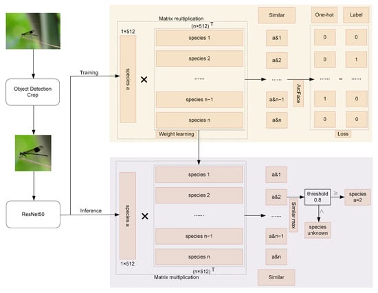 We adapted a face recognition algorithm for dragonfly species classification. The methodology differs between the training and inference phases compared to conventional face recognition, as illustrated in Figure 3, which presents our species classification workflow.