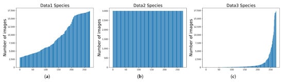 The model was trained on a dataset of dragonfly images processed using YOLOv10. We constructed three distinct datasets: Data1, Data2, and Data3, each containing 272 dragonfly species. Data1 consists of categories with over 1000 images per species, totaling 841,050 images. Data2 comprises exactly 1000 images per category, yielding 272,000 images in total. Data3 was created by randomly selecting 272 species from over 2000 available categories, resulting in an uneven distribution of images per species (ranging from 5 to 5790 images) and a total of 121,535 images. The image distribution across categories is illustrated in Figure 4. For each category within every dataset, the data were partitioned into training, validation, and test sets at a ratio of 6:2:2.