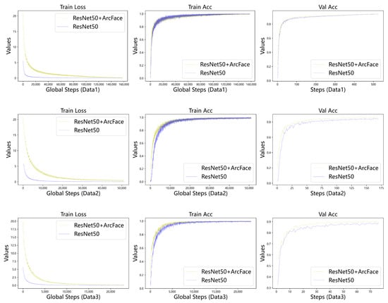 The ResNet50+ArcFace and ResNet50 models were trained on three datasets (Data1, Data2, and Data3), with sampling of training loss and accuracy during the process. Validation was performed every 100 iterations. As shown in Figure 5, the ResNet50+ArcFace model exhibits a slower rate of loss reduction with increasing training epochs compared to ResNet50 across the Data1, Data2, and Data3 datasets. However, it achieves higher training accuracy and consistently outperforms ResNet50 in validation accuracy.