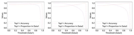 The ResNet50+ArcFace model evaluates the Top1-t accuracy on the test data, where varying the threshold t yields different accuracy rates and simultaneously affects the proportion of samples satisfying the threshold condition. To investigate the relationship between these two metrics, we selected 101 discrete thresholds from the interval [0, 1] with a step size of 0.01. For each threshold t, we recorded the corresponding Top1-t accuracy and the proportion of samples exceeding the threshold relative to the total sample size, as illustrated in Figure 6. Additionally, Table 4 presents the proportions of samples surpassing the thresholds of 0.7, 0.8, 0.85, 0.9, and 0.95.