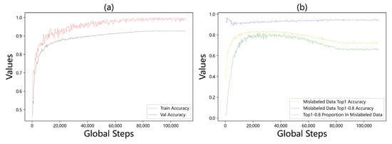 Model training process shows: (a) the training accuracy, validation accuracy; (b) Mislabeled Data Top1 Accuracy, Mislabeled Data Top1-0.8 Accuracy, and Top1-0.8 Proportion in Mislabeled Data at different global steps.