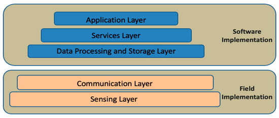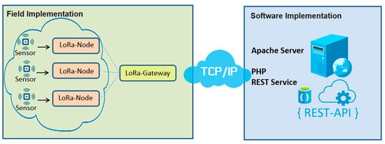 In the Field Implementation component, we utilise specialised LoRa nodes that facilitate seamless integration with various sensor modules, which are equipped with LoRa modules for effective communication. A LoRa Gateway is used to receive and process data transmitted by LoRa nodes. Once the gateway collects the data, it is sent to the Software Implementation component via a TCP/IP stack for reliable transmission of data. This architecture not only ensures efficient data collection but also supports the necessary communication protocols to maintain a smooth flow of information between the different layers of the system [29].