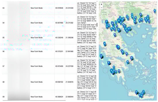 The selected sensor locations, as shown in Figure 5, serve as representative nodes within the broader cold supply chain ecosystem. These points simulate critical stages of the food supply chain, including storage facilities, distribution endpoints, and fields. The real-time environmental data (temperature, humidity, battery status, etc.) collected from these locations is directly integrated into the platform’s visualisation and alerting system. This integration enables continuous monitoring of product conditions during transportation and storage. Data from the selected locations was used to validate the system’s ability to detect deviations, ensure cold chain compliance with clients’ requirements, and provide services. For instance, in the context of agricultural operations, when a sensor node detects low humidity levels in a crop field, the system can automatically trigger an electric irrigation valve to activate, ensuring timely watering of the field [30].