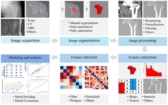 Radiomics, an advanced image analysis technique, has demonstrated potential in quantitative, comprehensive, and automated high-throughput extraction of features from clinical images [12,13]. It excelled in mining image information and capturing disease characteristics that may not be readily detectable by the human eye [14]. Radiomics, as a quantitative analytical tool, has facilitated improved diagnostic and prognostic modeling in musculoskeletal disorders, from metabolic bone diseases like osteoporosis to degenerative and neoplastic conditions such as osteoarthritis and bone tumors [15,16,17]. Radiomics features extracted from bone images provided detailed insights into bone-quality-related information such as bone geometry, material distribution, and microstructure. Specifically, in the application of osteoporosis, these radiomics features have been employed to build classification and prediction models, facilitating bone strength assessment, osteoporosis diagnosis, and fracture risk prediction [17,18,19]. Currently, radiomics has demonstrated considerable advantages in osteoporosis. On one hand, bone-quality-related information from widely used clinical imaging modalities was efficiently extracted by radiomics, including radiographs, CT images, and magnetic resonance imaging (MRI) images, thus supporting opportunistic osteoporosis screening [20]. On the other hand, the radiomics-derived features, which differed from traditional bone quality parameters, hold potential as novel biomarkers for bone quality [21]. For instance, the radiomics feature wavelet-LLL_firstorder_10percentile employed wavelet transform to decompose complex signals, enabling effective quantification of the intricate structure of vertebrae [22,23]. This feature demonstrated high performance in detecting osteoporotic vertebral fractures, with an area under the curve (AUC) of 0.76 [23]. Additionally, entropy within the texture features was considered a potential sign for bone damage [24]. Therefore, radiomics offers a promising method for enhancing opportunistic osteoporosis screening, improving fracture risk prediction, and providing therapeutic efficacy assessment. The general workflow for applying radiomics to osteoporosis is depicted in Figure 1. It consists of six steps: image acquisition, image segmentation, image processing, radiomics feature extraction, radiomics feature selection, and modeling and analysis.