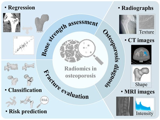 In this review, current applications and the development of radiomics in osteoporosis were summarized. It was critical to conduct an accurate assessment of bone strength for predicting fracture risk. Thus, the utilization of radiomics for assessing bone strength was reviewed. Additionally, the application of radiomics derived from CT images, radiographs, and MRI images for diagnosing osteoporosis and predicting fracture risk was provided. Finally, the advantages, limitations, and potential clinical applications of radiomics in bone strength assessment, osteoporosis diagnosis, and fracture risk prediction were analyzed and summarized. The outline of this review is shown in Figure 2.