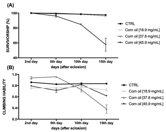 Behavioral parameters. (A) Longevity and (B) Climbing ability of Drosophila melanogaster (n = 120) submitted to a diet supplemented with corn oil and statistical analyses as Supplementary Materials (Figures S1 and S2). The values represent the mean ± SEM (One-Way ANOVA and nonparametric) of three experiments.