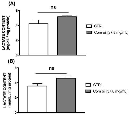 Lactate concentration in (A) heads and (B) thoraces of Drosophila melanogaster fed on a diet supplemented with corn oil (n = 100). The values represent the mean ± SEM (unpaired t test) of three experiments. The results were considered statistically significant when p < 0.05.