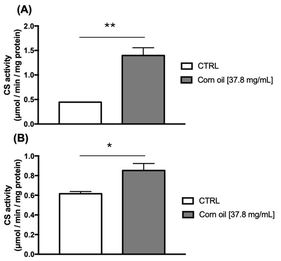 CS activity in (A) heads and (B) thoraces of Drosophila melanogaster fed on a diet supplemented with corn oil (n = 100). The values represent the mean ± SEM (unpaired t test) of three experiments. The results were considered statistically significant when * p < 0.05, ** p < 0.01.