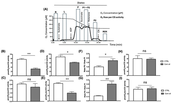 Flies fed corn oil exhibited increased CS activity in the head (p < 0.01) (Figure 5A) and thorax (p < 0.05) (Figure 5B). CS is a key enzyme of the Krebs Cycle and is commonly used as an indicator of mitochondrial content. Corn oil supplementation enhanced head tissue respiration in the Routine state (endogenous substrate, p < 0.01; Figure 6B) and in the LEAK state (with exogenous substrate, p < 0.05; Figure 6D). Additionally, the P2/P1 ratio analyses support oxidative phosphorylation facilitated by NAD+-linked substrates (State P1) or succinate (State P2), showing a higher mitochondrial complex 2 relative to complex 1 in the heads (p < 0.05) (Figure 6F) and thoraces (p < 0.01) (Figure 6G) of flies fed corn oil. No significant changes were noted in State Rox (oxygen consumption unrelated to respiratory chain activity) (Figure 6H,I).