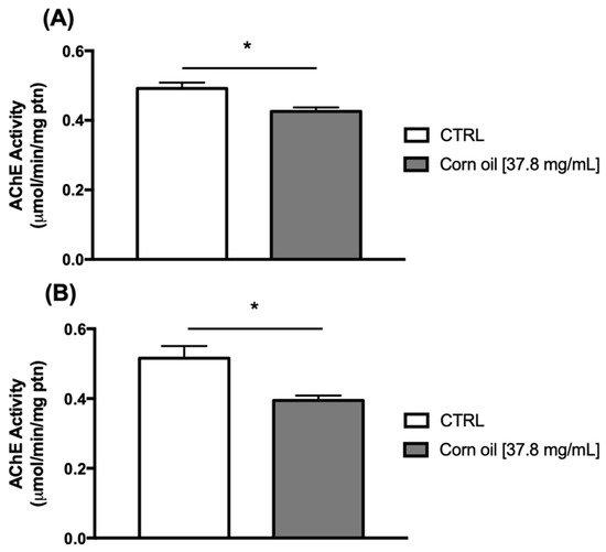 AChE activity in (A) heads and (B) thoraces of Drosophila melanogaster fed on a diet supplemented with corn oil (n = 100). The values represent the mean ± SEM (unpaired t test) of three experiments. The results were considered statistically significant when * p < 0.05.