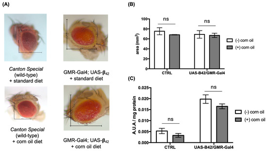 Initially, this study assessed the morphological changes in the eyes of mutant flies fed a diet supplemented with or without corn oil (Figure 8A). Subsequently, we examined changes in the eye area; however, these were not statistically significant (Figure 8B). Total amyloid content was evaluated using Congo Red to verify the amyloidogenic pathway from AD-like [19]. Flies expressing human APP and β42 fragments showed no significant changes in the detection of amyloid protein fragments (Figure 8C).