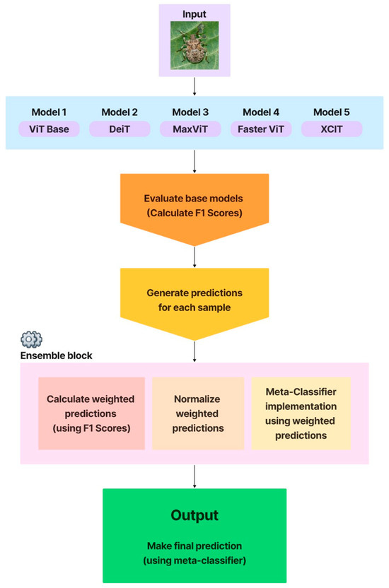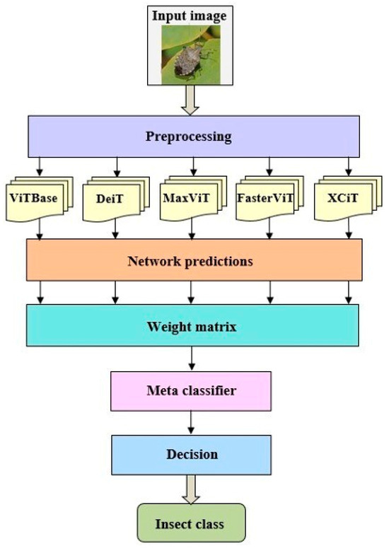 A stacking-based ensemble system with a meta-classifier was implemented to classify insect species from IP102 and D0 datasets. This approach combined the predictions of some base classifiers (weak learners), leveraging their diverse strengths to improve overall classification performance. By integrating the outputs of the base models, the meta-classifier learned how to effectively weigh and combine their predictions, resulting in a more robust and accurate ensemble model. The base models can be of any type and provide various perspectives on the data [19,36]. The presented ViT-type architectures were used as base models. The meta-classifier (global system) learned how to combine these perspectives to improve overall prediction accuracy.