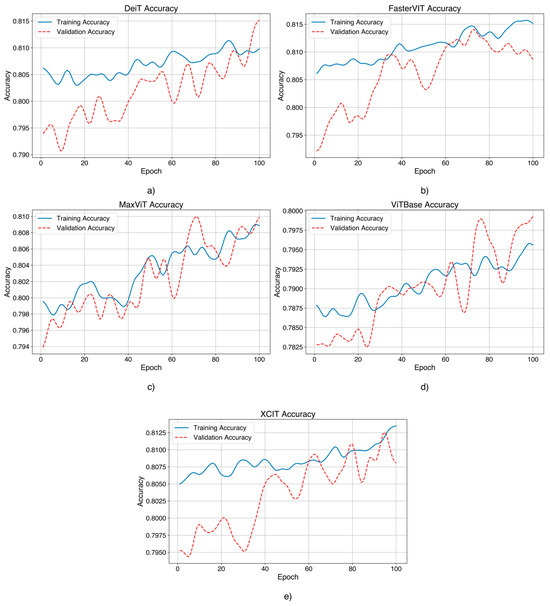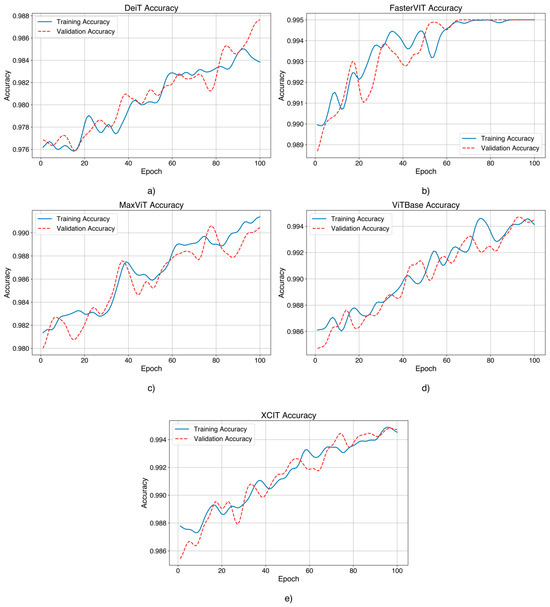 Accuracy during training and validation over 100 epochs for D0 dataset models: (a) DeiT, (b) FasterViT, (c) MaxViT, (d) ViT Base, and (e) XCiT. Training curves indicate stable convergence behavior with minimal overfitting.