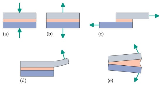 Five different load cases of adhesive bonds, whereby a bond is made up of the two bonding partners (gray and blue) and the adhesive (orange). (a) Compressive loading. (b) Tensile loading. (c) Shear loading. (d) Peel loading. (e) Split loading.