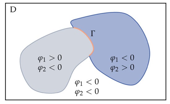 The combination of the values of the two level set functions (gray) and (blue) represents the multi-material system in the design domain D. The interface of the two materials is referred to as [15].