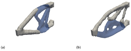 Figure 8a shows the result of the pure multi-material topology optimization and in Figure 8b that with consideration of the ITED. Analogous to the cantilever, it can again be seen that the second material is distributed over the cross-section (y-direction) in the pure multi-material topology optimization and that the second material is primarily located in the upper area when the ITED is taken into account. It is also noticeable that the second material consists of two components in the optimization with consideration of the ITED compared to one in the pure multi-material topology optimization.